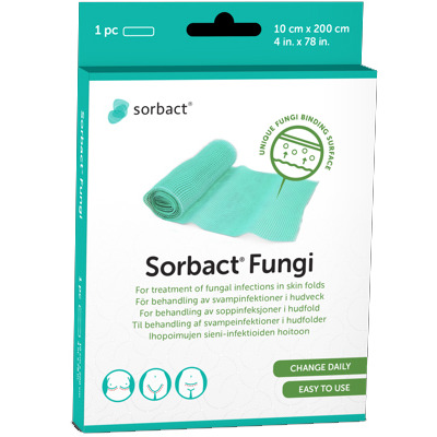Med Sorbact Fungi er det nemt at behandle svampeinfektioner i hudfolder uden brug af klistrede salver og cremer. Svampen binder sig til Sorbact og fjernes hver gang det skiftes.