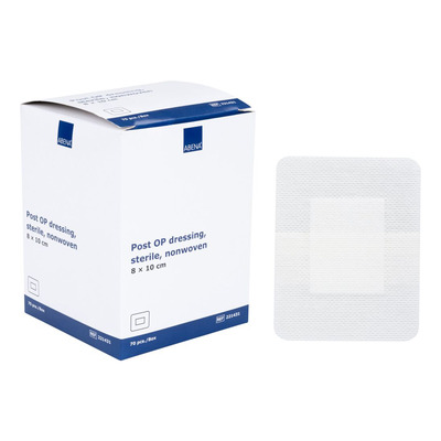Abena Post-OP Forbinding, 8 x 10 cm, er en steril og fleksibel bandage, der er velegnet som primær forbinding til tørre og let væskende sår. Forbindingen har en blød nonwoven bagside med en hudvenlig acrylicklæber, der sikrer, at den sidder godt fast uden at irritere huden. Den centrale sårpude er lavet af blød polyester, som effektivt absorberer væske og ikke hænger fast i såret. Materialet tillader huden at ånde gennem forbindingen.