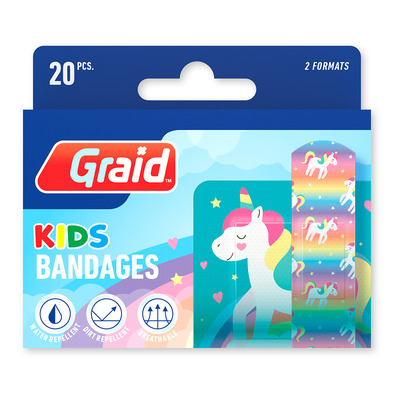 Graid Kids Bandages Unicorn er specielt designet til at gøre førstehjælp sjovt og farverigt for børn. Disse charmerende enhjørningsplaster er ikke kun attraktive med deres livlige design, men de er også yderst funktionelle. Fremstillet af et blødt og fleksibelt materiale, der er 75% viskose og 30% polyester, sikrer disse plaster komfort og holdbarhed. De er vandafvisende, hvilket gør dem ideelle til brug i alle situationer, uanset om det er hjemme, i skolen, eller under udendørs leg. Med perforeringer sikres åndbarhed, hvilket hjælper med at fremme heling af småskrammer.