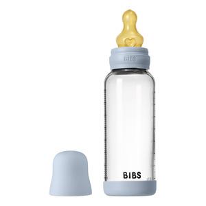 BIBS Glass Baby Bottle Round Latex 240 ml. Medium Flow Baby Blue er en sikker og varmebestandig sutteflaske