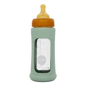 Hevea Glas Sutteflaske Wide Neck på 250 ml. med sleeve i farven Seafoam Blue virker varmebeskyttende