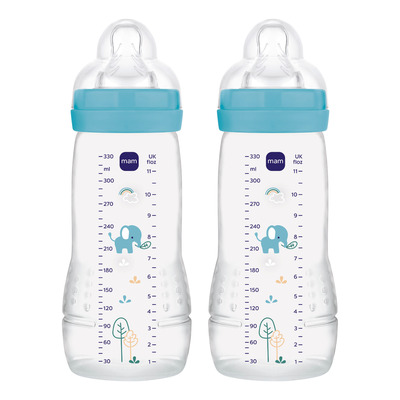 MAM Easy Active Baby Bottle passer godt til brug med modermælkserstatning og er fri for unødvendige tilsætningsstoffer. Alle dele, undtagen sutten, er fremstillet af polypropylen tilknyttet biobaserede materialer. Pakken indeholder 2 flasker i en flot blå farve.