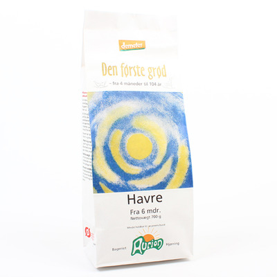 Aurion har lavet børnevenlig glutenfri grød - serien kaldes Den Første Grød. Denne variant er med 100% økologisk havremel.
