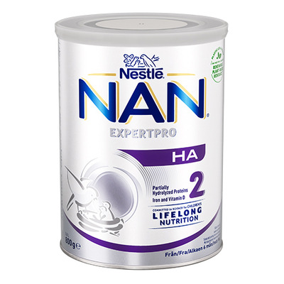 NAN EXPERTPRO HA 2 er en mælkebaseret tilskudsblanding, som du kan give fra barnets 6. måned. Tilskudsblandingen indeholder delvist hydrolyseret protein og, ifølge lovgivningen, den langkædede flerumættede fedtsyrer docosahexaensyre, der også kaldes DHA. Tilskudsblandingen er desuden tilsat den aktive bakteriekultur Bifidobacterium Lactis samt de langkædede flerumættede fedtsyrer omega 3 og 6. NAN EXPERTPRO HA 2 indeholder ydermere vitamin D, som bidrager til immunsystemets normale funktion.