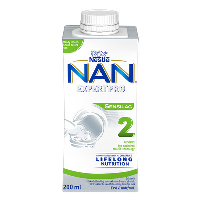 NAN EXPERTPRO SENSILAC 2 er en drikkeklar tilskudsblanding udelukkede baseret på mælk og tilpasset behovet hos raske babyer fra 6 måneder som en del af en varieret kost. Tilskudsblandingen indeholder en fiberblanding GOS (Galacto‐oligosaccharider) & FOS (Fructo‐oligosaccharider) og avanceret proteinteknolog.