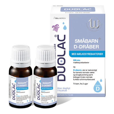 Duolac Daglig+ D-dråber til småbørn er et kosttilskud med levende mælkesyrebakterier og D-vitamin til brug for børn i alderen 2 uger til 4 år. Dråberne indeholder 4 forskellige nøje udvalgte mælkesyrebakteriestammer af typerne Bifidobakterier og Lactobacillaceae. Mælkesyrebakterier findes naturligt i tarmsystemet og bidrager til en normal fordøjelsesfunktion.