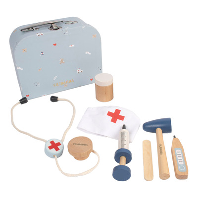 Filibabba Legekuffert – Doktorsæt i træ inviterer børn til at udforske lægeverdenen gennem leg. Sættet indeholder 8 dele, blandt andet stetoskop, sprøjte og termometer, som alle opbevares i en robust papkuffert med metalhåndtag. Perfekt til leg med bamser og dukker, både derhjemme og på farten.