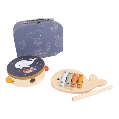 Filibabba Legekuffert - Mine første instrumenter i træ indeholder tre enkle musikinstrumenter: en xylofon, et sæt kastagnetter og en tamburin. Alle dele er fremstillet i træ og tilpasset små hænder. Sættet opbevares i en papkuffert med metalhåndtag og hængsler, som gør det nemt at tage med eller stille væk.