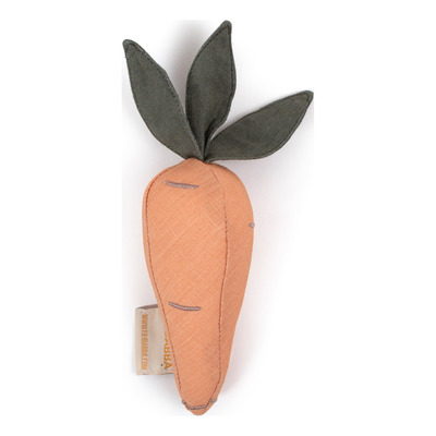 Sød lille rangle formet som en gulerod og lavet af blødt hørstof. Den farverige gulerod vil hurtigt fange din babys interesse og har masser af fine detaljer, som små hænder bare vil udforske. I ranglen gemmer der sig en lille klokke med en blød ringelyd, som babyen sikkert vil elske. Størrelsen er lille, så dit barn kan gribe om og holde ranglen.