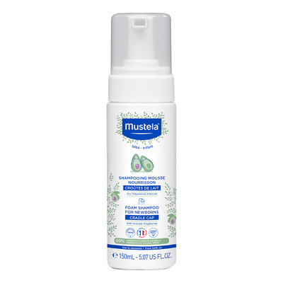 Babyshampooen fra Mustela er en mild shampoo, der er udviklet til at rense den nyfødtes hovedbund på daglig basis, som samtidig hjælper med at eliminere vuggehætte. Mustela Foam Shampoo For Newborns får en skummende konsistens, når den anvendes og er uden tilsat parfume.