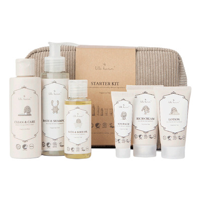 Lille Kanin Starterkit indeholder seks essentielle produkter i en praktisk toilettaske, som giver god plads til alle produkterne og ekstra tilbehør som bleer og vatrondeller. Startkittet er ideelt som gave eller til nybagte forældre, der ønsker sikre og effektive plejeprodukter til børn og voksne. Produkterne er skabt med omtanke for hudens sundhed og miljøet, og de indeholder ingen skadelig kemi.