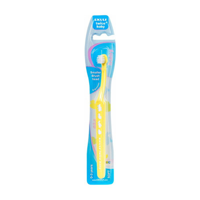 EKULF Twice Baby 0-3 år er en tandbørste, som har et kompakt designet børstehoved med bløde børster. Børstehovedet er meget mindre end en almindelig tandbørste, for at det skal være let at børste alle tandfladerne. De bløde børstehår gør børstning af tænder og tandkød skånsom.