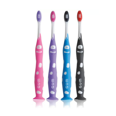 Gum Junior tandbørste er udviklet specielt til børn fra 7-9 års alderen, hvor de blivende tænder begynder at vokse frem i munden. Den er udstyret med et ergonomisk håndtag, bløde børstehår for en behagelig og effektiv tandrengøring, samt smart sugekop, så tandbørsten kan stå op og tørre mellem hver brug.