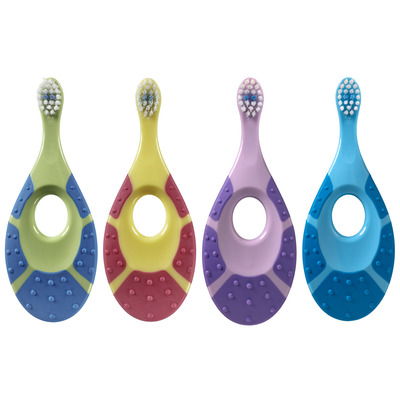Det korte, brede håndtag fungerer samtidig som bidering og er nemt for både barn og forælder at holde. Tandbørsten er udstyret med en smart indikator, der viser den anbefalede mængde tandpasta til børn i alderen 0-2 år, hvilket gør det lettere at dosere korrekt.