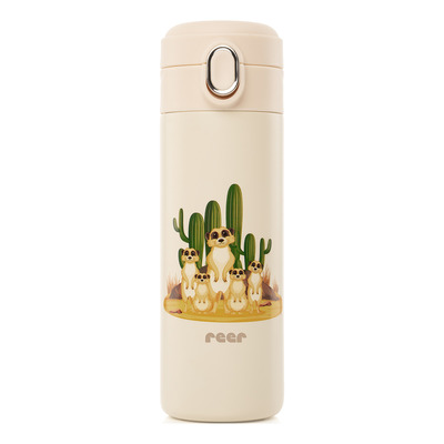 Reer Drikkedunk m. Sugerør Creme er en smart og sikker drikkedunk til børn. Den er designet med en praktisk trykknap, der nemt åbner låget og får sugerøret til at komme frem. Knappen kan låses, så drikkedunken ikke åbner utilsigtet i tasken. Den rummer 350 ml. og er derfor ideel til både skole, børnehave og udflugter. Det søde design med desmerdyr og kaktusser gør den ekstra børnevenlig.