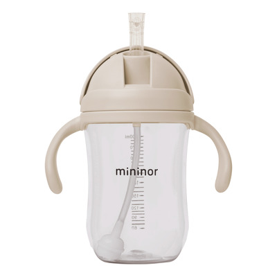 Mininor Sugerørskop Skyet Morgen har bløde, ergonomiske hanke, der gør det nemt for barnet at holde koppen selv. Den er fødevaregodkendt og tåler opvaskemaskine på øverste hylde. Designet er enkelt og praktisk i en neutral beigefarve.