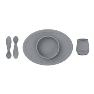 EZPZ First Foods Set er et komplet spisesæt i stilfuldt design udviklet specielt til børn i alderen 4-6 måneder og opefter. Sættet indeholder henholdsvis dækkeserviet med indbygget skål, 2 stk. skeer samt en drikkekop - det hele i stilren grå og med blød, silikonebelagt overflade, som både er skånsom for gummer og nye tænder samt sikrer et godt greb.