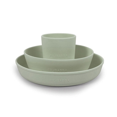 Dette spisesæt fra Filibabba består af en mellemstørrelse kop samt en skål og tallerken med en praktisk sugekop under bunden. Alle dele i dette sæt er fremstillet i 100% silikone, der sikrer dig og dit barn et godt greb. Koppen har en god størrelse til børnehænder, så dit barn selv kan holde på den. Både skålen og tallerkenen står fast på bordet med sugekoppen, så der ikke spildes for meget. Filibabba Silikone Spisesæt tåler desuden både mikroovn, fryser og opvaskemaskine.