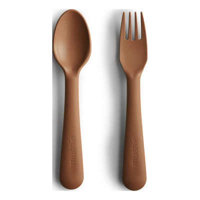 Mushie Gaffel & Ske i farven Caramel er stilrent og elegant børnebestik, som kan bruges til fodring eller selvspise