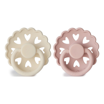 Denne 2-pak med sutter fra FRIGG er en del af Fairytale-kollektionen, som er inspireret af H.C. Andersens magiske eventyr. Sutterne er med deres fine kanter inspirerede af H.C. Andersens papirklip samtidig med, at de 8 små hjerter i silikone-skjoldet symboliserer kærlighed og omsorg. FRIGGS Fairytale-sutter har en tut der, med sin runde brystvorteform, ligger godt i munden på barnet, idet den ligner mors bryst i både form og materiale. Denne form for sut anbefales af pædiatriske fagfolk i Danmark.