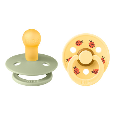 BIBS Studio Colour Ladybug Latex Sage Mix kombinerer funktionalitet med et sødt og unikt design. Pakken indeholder to sutter i farverne gul og grøn, begge dekoreret med små mariehøns. Det klassiske runde BIBS-skjold har tre udluftningshuller, der sikrer god luftcirkulation og mindsker risikoen for hudirritation. Nipplen er fremstillet af blød naturgummilatex, som giver en behagelig sugeoplevelse.