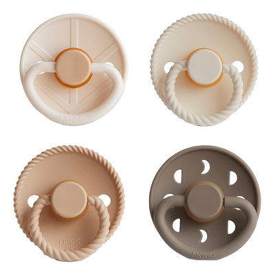 Pakken indeholder fire sutter i dæmpede farver: to FRIGG Rope (Cream og Croissant), én FRIGG Moon Phase (Portobello) og én FRIGG Little Viking (Lagertha/Cream). Alle har skjold i polypropylen og click-lock® system. Sutten måler 30 mm og rengøres let med kogt vand.