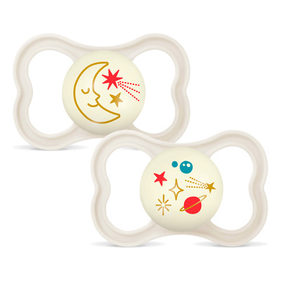 Suttens unikke MAM SkinSoft silikoneoverflade føles ekstra blød og behagelig, hvilket gør det lettere for barnet at acceptere sutten. Den ortodontiske form støtter den sunde udvikling af barnets kæbe og tænder. MAM Air Night sut har også en praktisk selvlysende funktion, der gør det nemt at finde sutten i mørke.