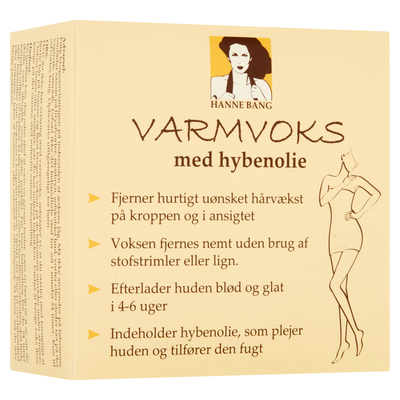 Hanne Bang Varmvoks anvendes helt uden voksstrimler og indeholder desuden hybenolie, som nærer og fugter huden