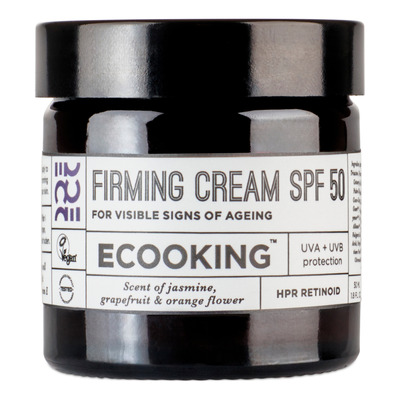 Ecooking Firming Cream SPF50 indeholder HPR retinoid, grønalgeekstrakt og stamcelleekstrakt, som arbejder i dybden med at reducere udtrykket af fine linjer og give huden mere glød og fylde. Produktet er vegansk og dermatologisk testet.