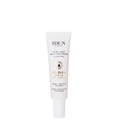 Ultra Light Face Cream SPF 50 fra IDUN Minerals har en super let konsistens, der er nem at fordele, hurtigt absorberes og føles behagelig på huden. Den er desuden vegansk, cruelty-free og formuleret uden parfume. Dagcremen kan bruges på absolut alle hudtyper, og så leveres den i genanvendelig emballage.