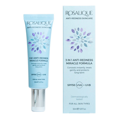 Rosalique 3 in 1 Anti Redness Formula er en højeffektiv dagcreme med unik 3i1-formel, som nærer, dulmer og beskytter din hud ved hver brug. Den er blandt andet beriget med grønne mikrosfærer samt a-bisabolol, zeolit, provitamin B5 og sheasmør, som virker beroligende på irritation og rødme. Cremen indeholder desuden solbeskyttelsesfaktor 50, som skærmer huden mod frie radikaler og skadelige UV-stråler.