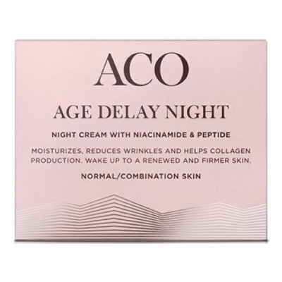 ACO Age Delay Natcreme Normal hud er en fugtgivende natcreme, der hjælper hudens kollagenproduktion