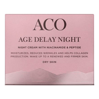 ACO Age Delay Natcreme Tør hud er en rig og nærende anti-age natcreme med peptider og niacinamid