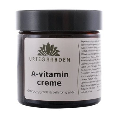 Urtegaarden A-vitamincreme er en let ansigtscreme, der hjælper huden med at holde på fugten, alt imens den hjælper med at genopbygge hudens naturlige spændstighed og forebygger dannelsen af rynker. A-vitamin og granatæbleolie stimulerer huden naturlige produktion af collagen, så cellefornyelsen og hudens elasticitet styrkes. Det høje indhold af essentielle fedtsyrer og aloe vera juice nærer huden på optimal vis og efterlader den blød og glat.