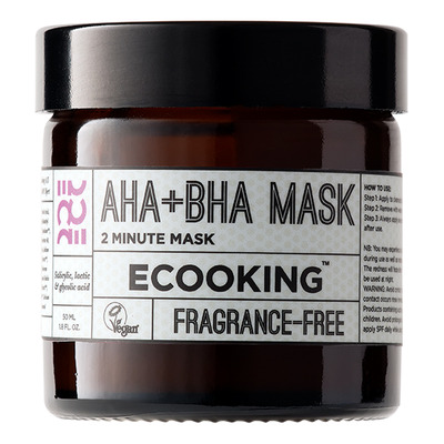 Ecooking AHA+BHA Mask er en effektiv ansigtsmaske, der reducerer pigmentpletter med en kombination af 26% AHA-syrer og 2% BHA-syre. Masken indeholder mælke- og glykolsyre, der eksfolierer huden og fjerner døde hudceller. Frugtekstrakter fra appelsiner, citroner, blåbær, sukkerrør og sukkerløn bidrager med naturlige syrer, som polerer huden og stimulerer cellefornyelsen. Dette mindsker ikke kun mørke pletter, men også urenheder, fine linjer og porer.