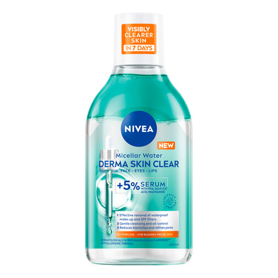 Nivea Derma Skin Clear Serum-Infused Micellar Water renser skånsomt huden og fjerner makeup, snavs og SPF
