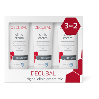 Decubal Clinic Cream nærer og fugter huden med sit indhold af bl.a. dimethicone, som blødgør og lægger et beskyttende lag på huden, der hjælper med at holde på fugten. Desuden indeholder cremen glycerin, som minimerer irritation, rødme i huden og hjælper med at genopbygge hudbarrieren. Indholdet af oprenset lanolin sørger for at cremen trænger hurtigt ind og blødgør huden. Decubal Clinic Cream kommer i et sæt med 3 cremer.