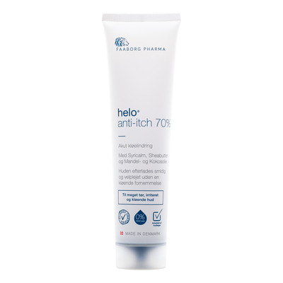 Helo Anti-Itch 70% er en del af Faaborg Pharmas fedtrige Helo-serie. Cremen har beroligende egenskaber gennem ingrediensen syricalm, som virker beroligende og kløestillende på huden. Cremen er tilsat panthenol (vitamin B5), som opretholder hudens naturlige helingsproces. Vitaminet sørger for at genoprette hudens naturlige fugtbalance og sikrer at fugten bevares i huden. Cremens høje fedtindhold består bl.a. af naturlige fedtstoffer såsom kokos- og mandelolie, der virker både beskyttende, fugtbevarende og blødgørende på huden. Helo Anti-Itch 70% cremen er særlig velegnet til en tør og irriteret hud med tendens til let kløen. Cremen er Allergy Certified og indeholder ikke parfume.