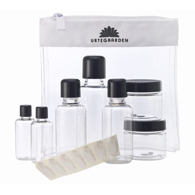 Urtegaarden Rejseemballage-sæt består af en håndbagage-venlig toilettaske, 6 opbevaringsflasker af plast samt etiketter.