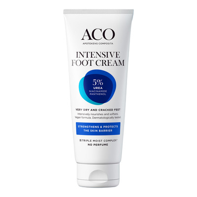 ACO Intensive Foot Cream er en ekstra fyldig fodcreme, der er udviklet til meget tør og hård hud. Med 5% urinstof, 2% niacinamid og 4% panthenol giver cremen dybdegående fugt og styrker hudbarrieren. Den absorberes hurtigt og efterlader huden blød og smidig uden en fedtet fornemmelse. Uden tilsat parfume og dermatologisk testet, ideel til sensitiv hud.