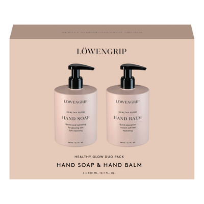 Löwengrip Healthy Glow Duo indeholder to produkter: Healthy Glow Hand Soap (300 ml) og Healthy Glow Hand Balm (300 ml). Håndsæben er mild og fugtgivende og er udviklet til at give huden en frisk glød. Den skummer op og renser hænderne skånsomt med en duft af honning og mysk.