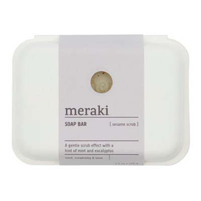 Meraki Sæbebar Sesame Scrub giver dine hænder en blid eksfoliering, mens du vasker dem. Denne faste sæbe fjerner døde hudceller ved hjælp af en sesamscrub, og de essentielle olier fra spearmint, cedertræ og eukalyptus giver en let kølende og opkvikkende effekt. Læg sæben i en sæbeskål på badeværelset eller i køkkenet for at holde håndvasken pæn og ryddelig.