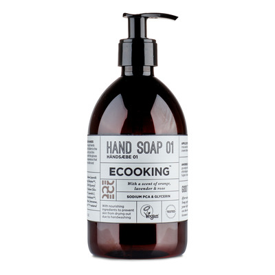 ECOOKING Håndsæbe O1 er en super mild og skånsom sæbe, som renser effektivt uden at udtørre huden. Den milde formel er dermatologisk testet, 100% vegansk og har en diskret, frisk duft af orange, lavendel og rose. Sæben kommer desuden i en fin 500 ml plastflaske med pumpe, som du kan genbruge til andre flydende væsker.