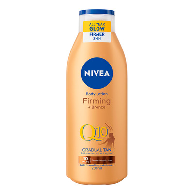 Nivea Q10 Firming + Bronze har en opstrammende formel med Q10 og giver en sommerlig glød hele året rundt