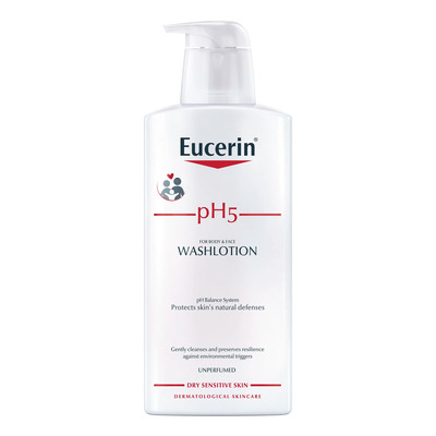 Eucerin pH5 Wash Lotion Unperfumed kan anvendes dagligt i badet og efterlader huden blød og velplejet. Den er dermatologisk testet og udviklet til at reducere hudirritation. Den skånsomme formel gør den velegnet til hele familien, inklusiv personer med sensitiv hud.