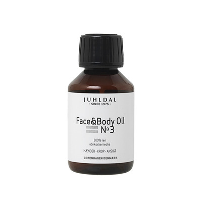 Juhldal Face & Body Oil No 3 er en 100% ren koldpresset abrikoskerneolie, som er uden duft og nogen form for tilsætning. Olien er multifunktionel og kan bruges som krops- og ansigtsolie, makeupfjerner, babypleje, neglepleje, til massage, hårspidserne og ved barbering. Olien trænger hurtig ind og beskytter mod eventuelle fugttab. Olien er rig på A- og E-vitamin. Olien egner sig særlig godt til personer med normal, sensitiv og tør hud.