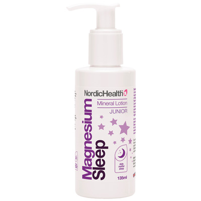 NordicHealth Magnesium Sleep Lotion Junior er udviklet til børn fra 1 år. Lotionen er er tilsat en blanding af lavendel og kamille, og virker muskelafslappende og beroligende. Lotionen er dermatologisk testet. Flasken indeholder i 135 ml lotion.