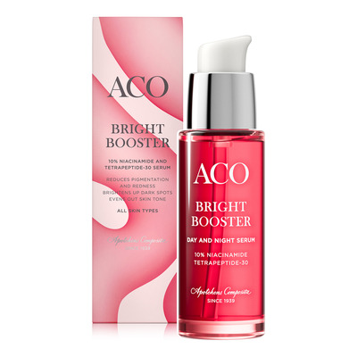 ACO Bright Booster serum hjælper med at reducere pigmentering og rødme i huden. Serummet lysner mørke pletter og udjævner hudtonen, så din hud får en mere ensartet og klar glød. Med 10% niacinamid og tetrapeptid-30 arbejder serummet på at mindske synlige tegn på ujævnheder og samtidig fugte huden i dybden. Serummet styrker også hudens barriere, så din hud fremstår mere jævn og frisk. ACO Bright Booster serum kan bruges hver dag både morgen og aften som en del af din daglige hudpleje.