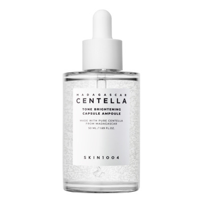 SKIN1004 Madagascar Centella Tone Brightening Capsule Ampoule er et beroligende serum, der fugter og udjævner hudtonen. Det er formuleret med 4% niacinamid og 2% tranexamsyre, som hjælper med at mindske pigmentpletter, akne-ar og solskader. Samtidig styrker centella asiatica-ekstrakt hudbarrieren og reducerer rødme og irritation. Serummet er velegnet til alle hudtyper, især ved sensitiv eller blussende hud.