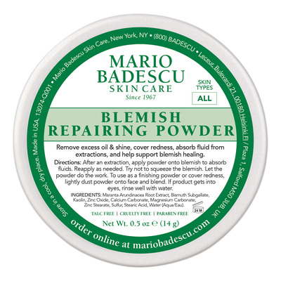 Mario Badescu Blemish Repairing Powder indeholder kaolin, zinkoxid og maranta-rod, som virker oliekontrollerende og beroligende. Dette pudder dækker synlige urenheder og pletter og giver huden et glattere udseende. Det er fri for parfume, parabener og talkum og kan anvendes dagligt efter behov.
